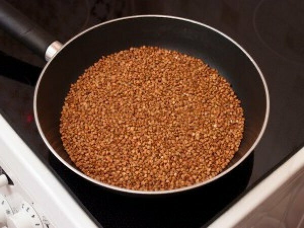 С предварительно промытой гречки тщательно сцеживаем воду и высыпаем крупу на сухую раскаленную сковороду. Прокаливаем крупу на среднем огне.