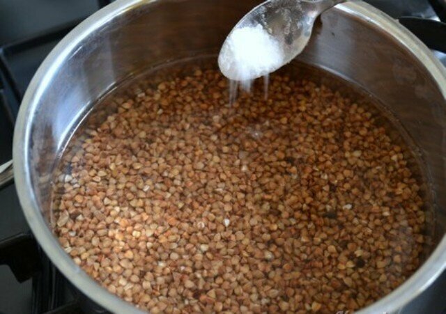 - Снова заливаем гречку водой (можно прямо из-под крана). Единственный ориентир – жидкость должна покрывать кашу примерно на палец. Добавляем соль, возвращаем кастрюлю на плиту, убавив огонь до среднего, и ждем, когда выпарится вся вода.