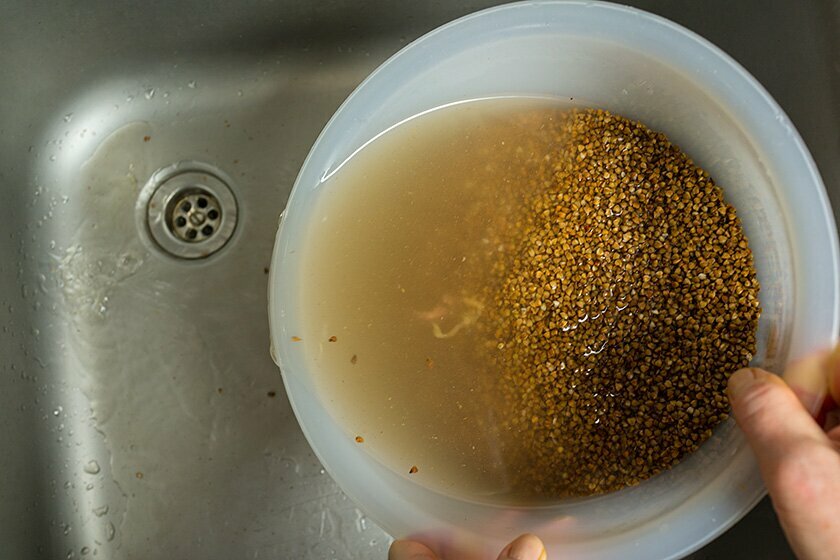- Воду из полуготовой каши осторожно сливаем. Вместе с ней сливается всплывший на поверхность мусор: посторонние примеси, шелуха, пустые темные зернышки, пыль.