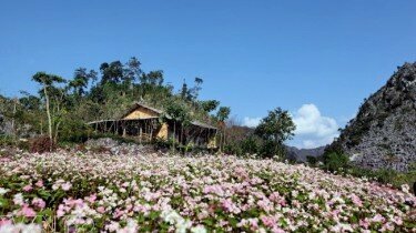 Цветущее поле гречихи окрашено во все оттенки розового.